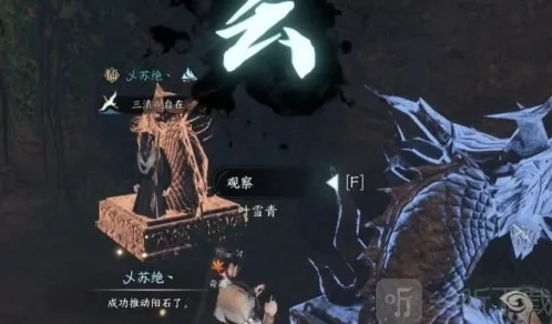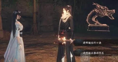 7、然后在天字诀石碑这里互动,之后在龙头这里推动阳石即左边的石头即可。