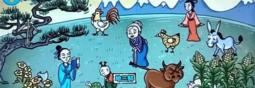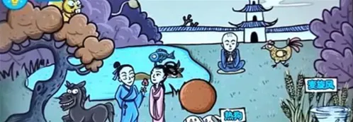 点击小孩出现地三鲜,点击牛尾巴出现牛肉拉面,将左边的话拖动到玉米上面出现爆米花,将斧头给书生出现生椰拿铁,点击女生出现老婆饼,将玉米地的破碗给母鸡出现叫花鸡,将玉米地的老母猪拖动到老奶奶旁边出现珍珠奶茶,点击驴出现驴打滚,将左边的弓箭拖动到公鸡的下面,点击一下弓箭发射出现宫保鸡丁,点击公鸡下单,将蛋拖动到树上,然后将左下角的花也拖动到树上出现松花蛋;