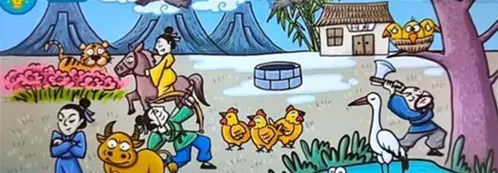 点击后面的山出现东山再起,点击云会出现闪电,然后将五个闪电拖动到房子上面出现五雷轰顶,点树上中间的那个鸟出现笨鸟先飞,将砍树的人放在房门前面出现班门弄斧,将白鹤拖动到鸡群里面出现鹤立鸡群,将青蛙拖动到水井里面出现井底之蛙,点击河边的草出现打草惊蛇,将蛇的尾巴拖动到老虎的尾巴上出现虎头蛇尾,点击男人的鼻子出现嗤之以鼻,把房屋旁边的竹子放在男人的身上出现胸有成竹,然后一直点击牛,当牛出汗的时候将其拖动到屋子里面出现汗牛充栋,点击马尾巴出现走马观花,将右上角的蜘蛛网放到马蹄印上面出现蛛丝马迹,点击天上飞行的大雁,出现雁过拔毛,当天上的老鹰重叠的时候点击弓箭出现一箭双雕;