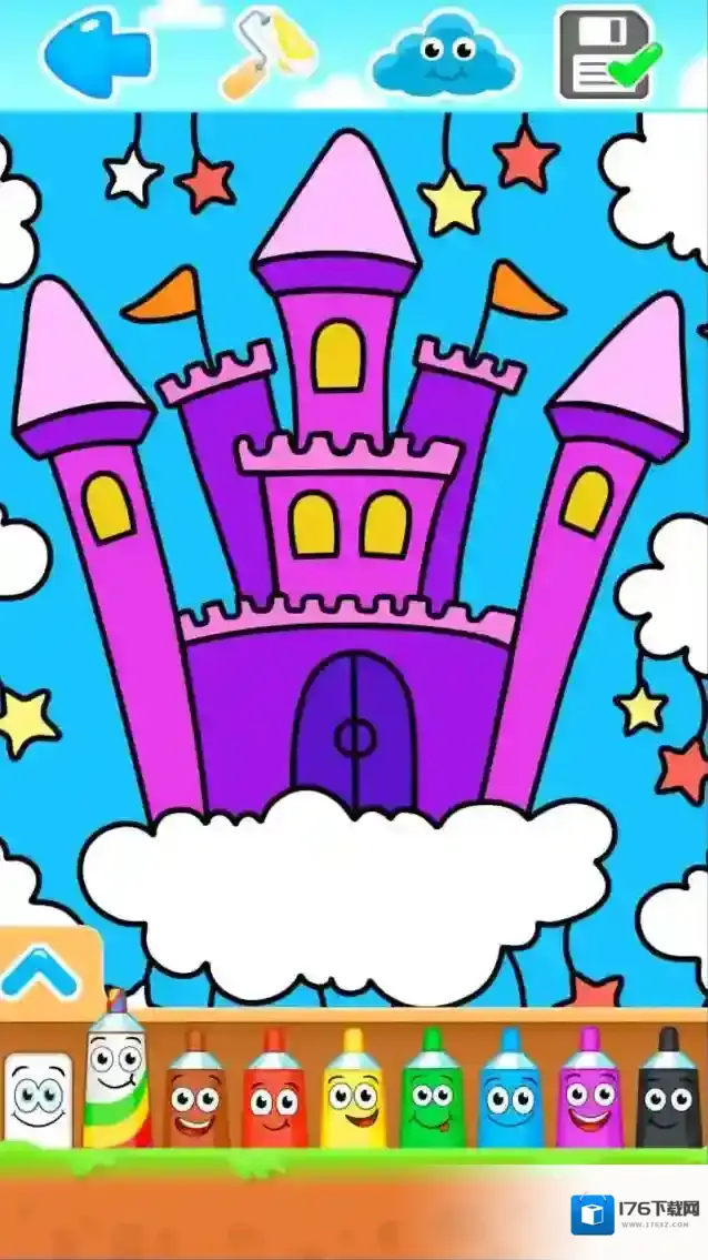 游戏提供了多种类型的画笔,各种趣味卡通图案印制在彩笔上,增添了美感。