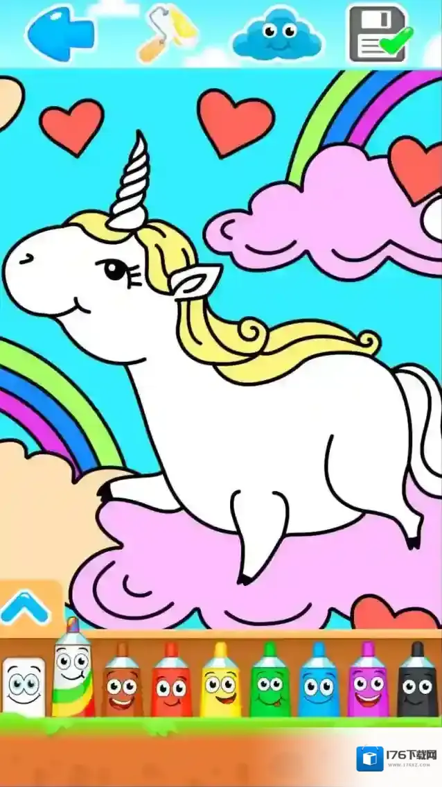 可以为可爱的独角兽设计惊艳的彩虹皮肤,使用相应的画笔进行涂色。