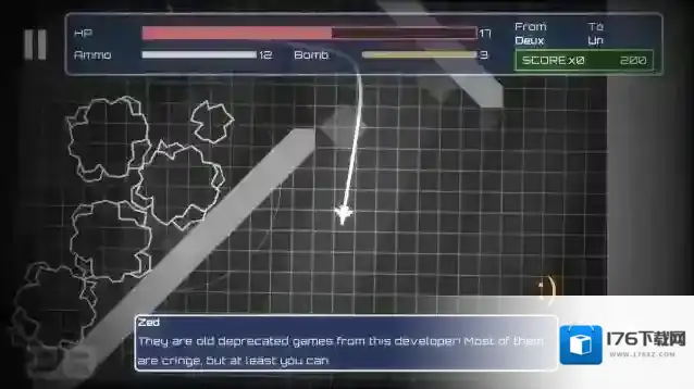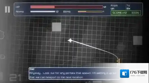 4、正式开始后点击左右屏幕可以控制飞行的方向,同时按住两边的屏幕可以发射子弹摧毁敌人和障碍物。屏幕上方的HP是血量,Ammo是弹药,Bomb是炸弹数量