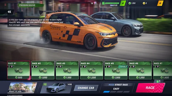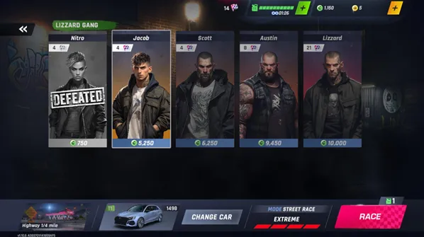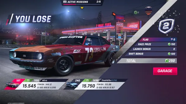游戏中的比赛和普通的赛车游戏不同,这里所有比赛都是1v1形式,玩家需要在一段距离内和对手进行一场较量,通过超越对手获得第一才会赢得胜利。改装你的车辆提升性能,把握好时机使用氮气加速和提升档位,不断在一场场比赛中获胜来体验最带感的竞速比赛吧。