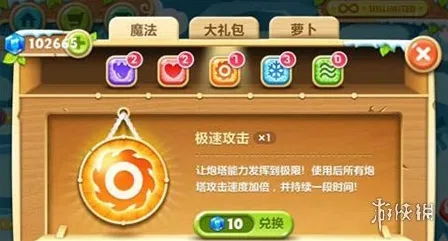 3、极限攻击:发挥炮塔的最大能力,使用一个极限攻击道具,即可将全屏炮塔的攻击速度提升至最快,效果持续10秒。兑换一个极限攻击道具需要10颗宝石。