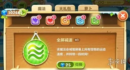 1、全屏减速:使用一个全屏减速道具,即可将全屏的所有怪物减速75%,效果持续5秒。兑换一个全屏减速道具需要25颗宝石。