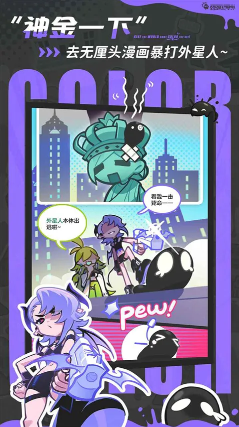 玩家化身打工恶魔,与神明组成染色小分队,使用染色武器攻击入侵的外星人,同时为黑白的地球涂抹色彩,完成闯关任务,找回世界本色。