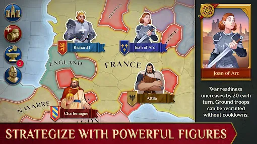 1、选择圣女贞德、斯维亚托斯拉夫、狮心王理查等众多历史人物作为王国的领袖,带领王国崛起!
