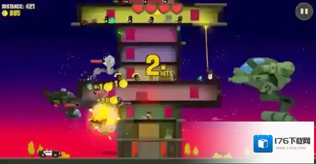 1、游戏中分为了两个部分,首先是驾驶车辆前进,寻找发射塔,过程中可以通过跳跃躲避障碍或者消灭敌人。