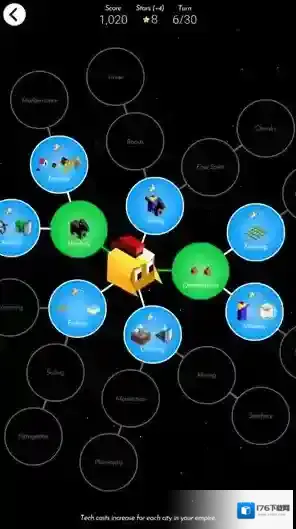 6、点击下方的tech tree可以打开科技树,能消耗星星来解锁不同的科技。