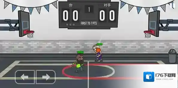 2、我们按住屏幕左下角的两个箭头可以控制角色移动,用手指按住屏幕右侧空白区域可以控制角色跳投,不过跳投的时候的注意一点,在主角跳到空中的时候就得放开手指,否者我们的角色是不会将篮球投出去的。