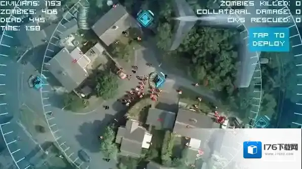 游戏打开就是这样一幅卫星地图,不像Osmos一样你控制其中一个人或者僵尸慢慢成长,你无能为力。身为旁观的上帝,世上万物都是自己的子民,他可以看着人类为了温饱屠杀牲畜,如今也不会介入僵尸和人类的战争。此游戏用了google的卫星地图,房屋上的瓦片,汽车,树木等物体都清晰可见。应用中没有人类穿红色的衣服,红色成了区分人类和僵尸的标志。
